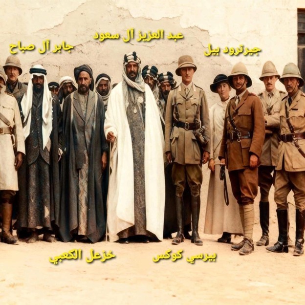 ތިޔަ ފެނިވަޑައިގަންނަވަނީ ފުރަތަމަ ބޮޑު ހަނގުރާމައިގެ ދުވަސްވަރު، 1916 ވަނަ އަހަރުގެ ނޮވެމްބަރު މަހުގެ 23 ވަނަ ދުވަހު ބޭއްވި، ފުރަތަމަ ރަސްމީ ޢަރަބި ސަމިޓްކަމަށްވާ [ކުވައިތު ކޮންފަރެންސް]ގެ ފޮޓޯއެކެވެ. އެ ކޮންފަރެންސުގެ މަގުސަދަކީ އިނގިރޭސިވިލާތުން ޢިރާޤަށް އަރައިގަތުމަށް އެހީތެރިވުމެވެ. އެ ދުވަސް ތާއަބަދަށް ހަނދާންކޮށްދޭ، މަދުން ނޫނީ ނުފެންނަ އެ ފޮޓޯގައި، އޭރު ނަޖުދުގެ އަމީރު، ފަހުން ސަޢޫދީ ޢަރަބިއްޔާގެ ރަސްގެފާނު ޢަބުދުލްޢަޒީޒް އާލު ސަޢޫދާ އެކު، އެ ފެންނަނީ އަހުވާޒުގެ ޝީޢީ އަމީރު ޚަޒަޢަލްކަޢުބީ، އަދި ކުވައިތުގެ އަމީރު ޖާބިރު ބިން މުބާރިކް އައްޞަބާޙެވެ. އެ މީހުންނާ އެކު، ދެން އެ ފޮޓޯގައި އެ ތިބީ ޢަރަބި ގަލްފްގެ އިނގިރޭސި ގަވަރުނަރު ޔަހޫދީ ސަރ ޕާރސީ ކޮކްސްއާއި އޭނާގެ މުޝީރު، އިނގިރޭސި ލިޔެކިޔުންތަކުގައި [ގަލްފްގެ ކިންގު މޭކަރ]ގެ ނަމުން މަޝްހޫރު އިނގިރޭސި ޖާސޫސެއްކަމަށްވާ ގަރޓުރޫޑް ބެލް ނަމަކަށް ކިޔާ މީހެކެވެ. އެ ސަމިޓުގައި ގަލްފުގެ ގާތްގަނޑަކަށް 100 ވަރަކަށް ޢަރަބި ޝަޚުޞިއްޔަތުން ބައިވެރިވިއެވެ. އޭގެ ތެރޭގައި ޝެހެޒާދާއިންނާއި، އިސްވާރުންނާއި، ޢަރަބި ޤަބީލާތަކުގެ ޝެއިޚުން ހިމެނޭ އިރު، އޭގެ ތެރޭގައި މުޠީރު، ޡަފީރު، އަދި ޢަޖުމާން ޤަބީލާގެ ޝެއިޚުން ހިމެނެއެވެ.